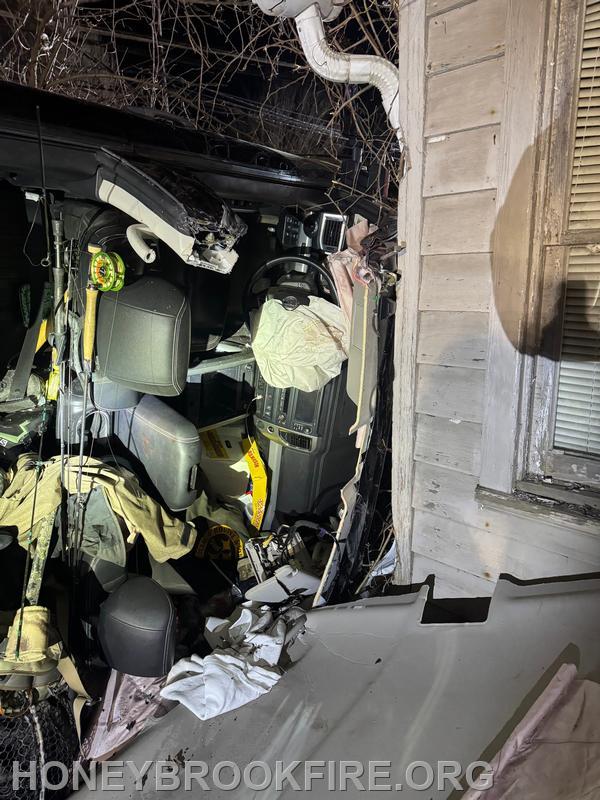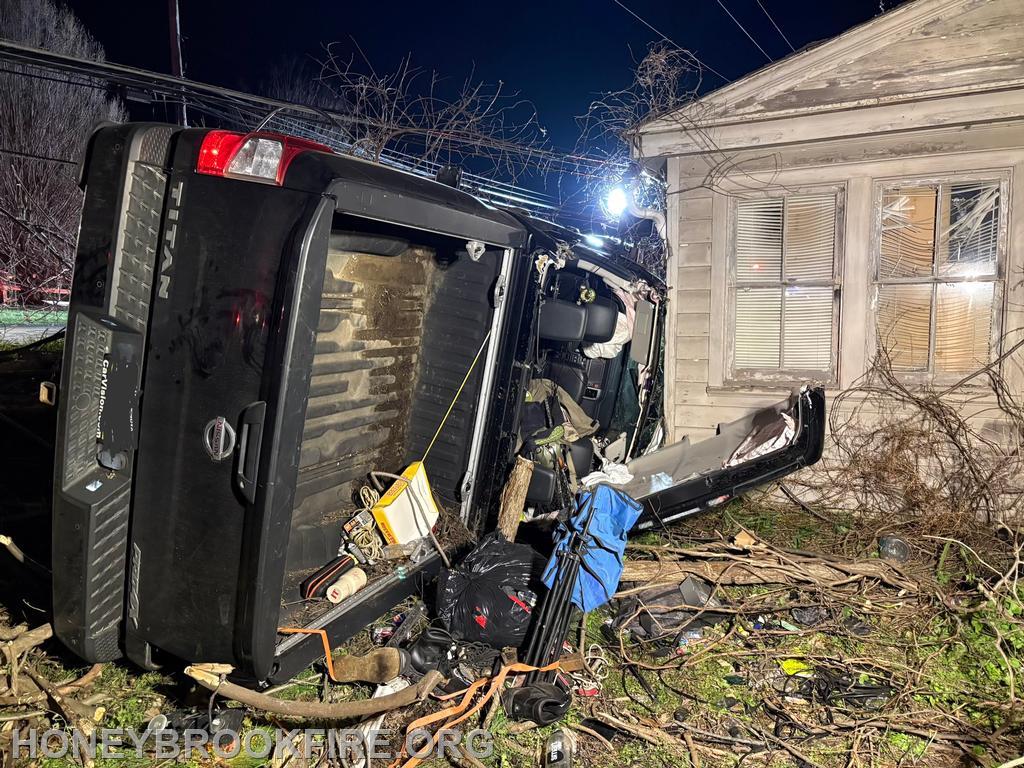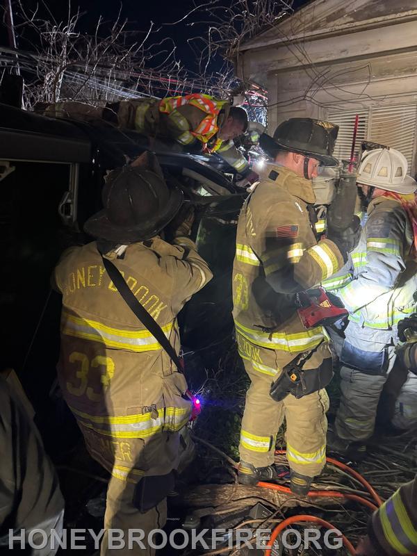Chief 33 arrived to find one vehicle on its side, resting up against a residence, with wires down and the vehicle’s operator trapped. The incident was upgraded and Chief 33 established the “Horseshoe Pike Command”. Crews confirmed the working area was safe from all overhead hazards before starting the extrication process. Personnel from R33 and E331 stabilized the vehicle and swiftly extricated one patient, who was transported to a local area hospital.